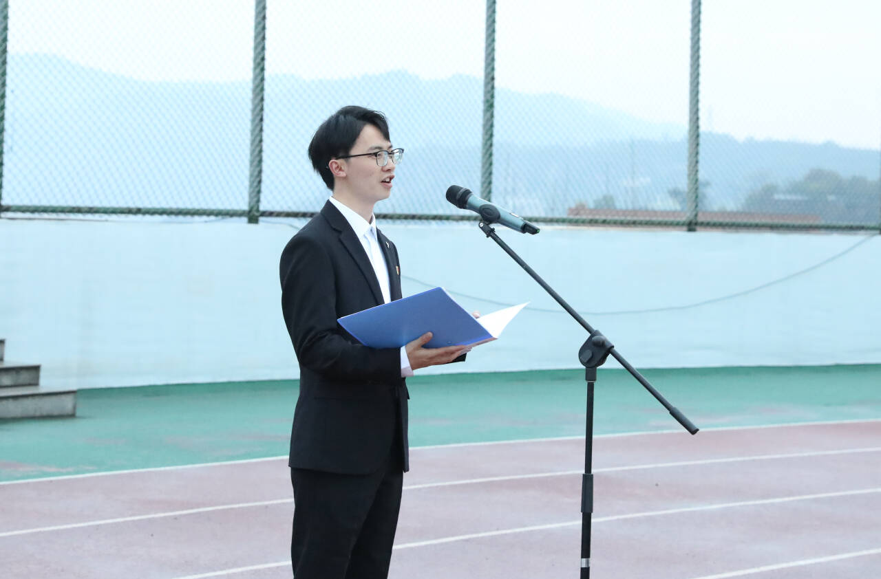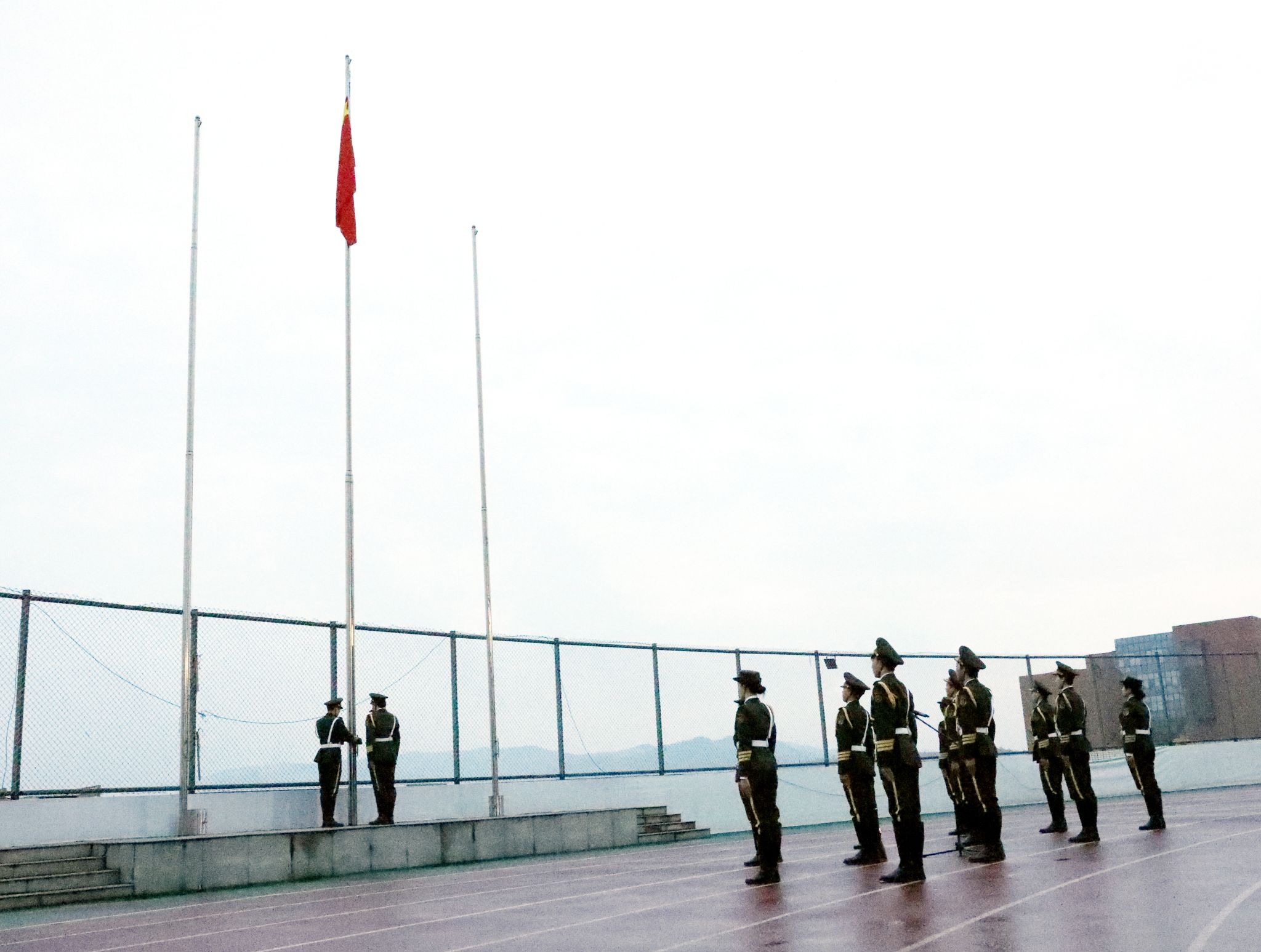 迎着晨曦,国旗护卫队迈着铿锵步伐护卫五星红旗入场,全体师生肃立行注目礼。雄壮的国歌声中,五星红旗冉冉升起,迎风飘扬。